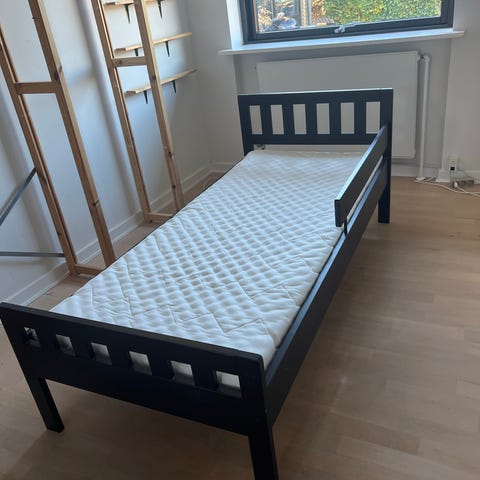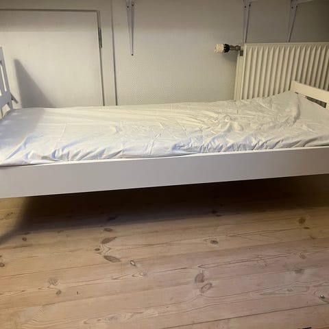 Madras medfølger. Fra røg- og dyrefrit hjem. Brugsspor hist og pist (se billeder), men ellers en super fin seng til børn i overgangen mellem tremmeseng og voksenseng.