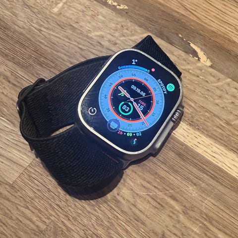 Apple Watch Ultra smartwatch med grøn alpine loop nylonrem.