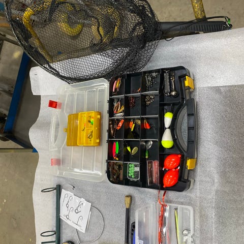 Fiskegrej i opbevaringskasse med diverse blink og kroge