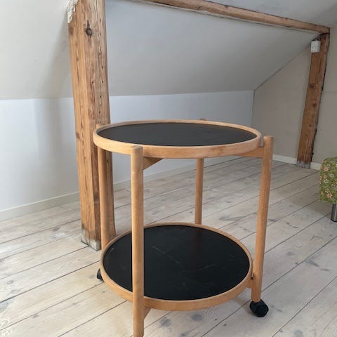 Fint bord med hjul og små skuffer til opbevaring.