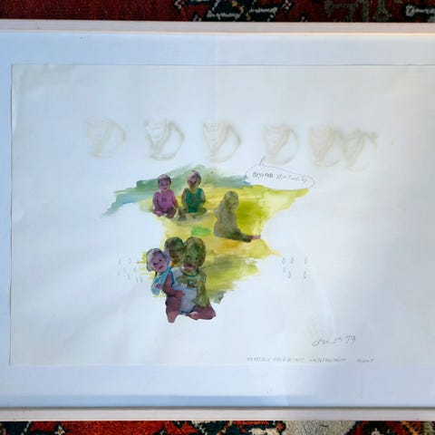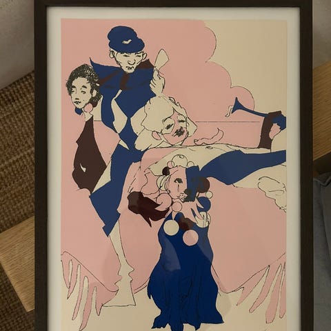 Silketryk / serigrafi, “Three figures, a trumpet and a dog” af Kaspar Oppen Samuelsen, fra 2025 i mørk egetræsramme. Nummereret og signeret af kunstneren. Mål: A3.