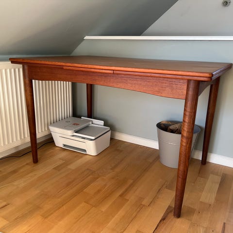 Lækker spisebord med hollandsk udtræk i teaktræ. Stellet er i egetræ.