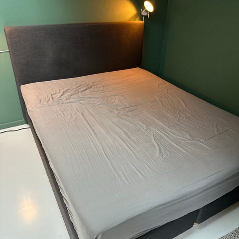 To boxmadrasser (Skotterud) hver på 80x200 cm samt topmadras 160x200 (Tustna) næsten som nye - brugt ca 10 gange som gæsteseng. Ben i lakeret eg.