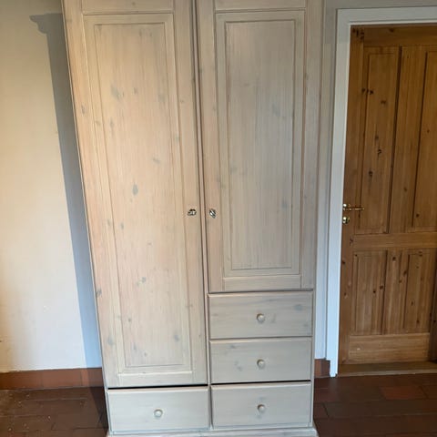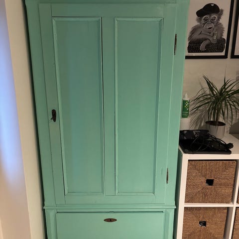 Grundet omrokering herhjemme, får vi dette charmerende skab tilovers. Som billederne viser, har det været brugt som klædeskab på børneværelse. Malet med træmaling i lys lilla og med hvide hylder.
