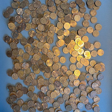 Pose med 640 stk. danske mønter af typen 25-ører i kobbernikkel. Mønterne er i serien fra 1966 - 1972 med Frederik IX og fra 1973 - 1988 med Margrethe II.