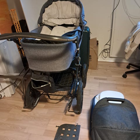 Babytrold barnevogn med lift og tilbehør.
