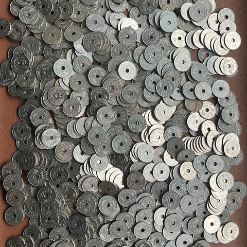 Pose med 315 stk. danske mønter af typen 25-ører i tinbronze. Mønterne er i serien fra 1972 - 2008 med Margrethe II.