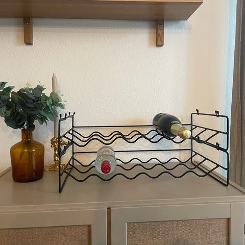 Vinreol i træ og metal sort plast med kapacitet til opbevaring af 42 vinflasker. Mål b61 x d23 x h61 cm.