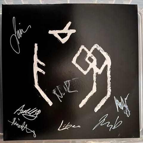 Musikalbum med titlen Til Rotterne Til Kragerne Til Hundene. Indeholder flere billeder og kunstnerportrætter i farverne lilla, blå og orange.
