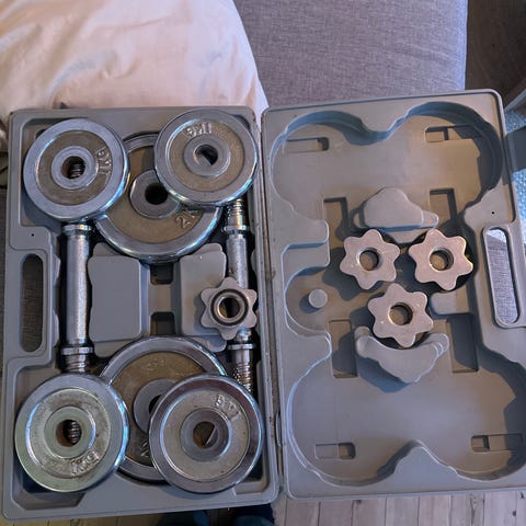 Der er 2 håndvægte og der er 8 styk 0 5 kg og 4 styk 1,1 kg brugte vægte men fejler ikke noget til øvelser