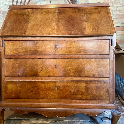 Antikt chartol fremstillet i træ med en rulledør, der åbner til et arbejdsområde med små skuffer og rum til opbevaring. Skrivebordet har desuden tre store skuffer under arbejdsfladen. Møblet har dekorative detaljer og ben i klassisk stil. Mål b97 x d49 x h97cm