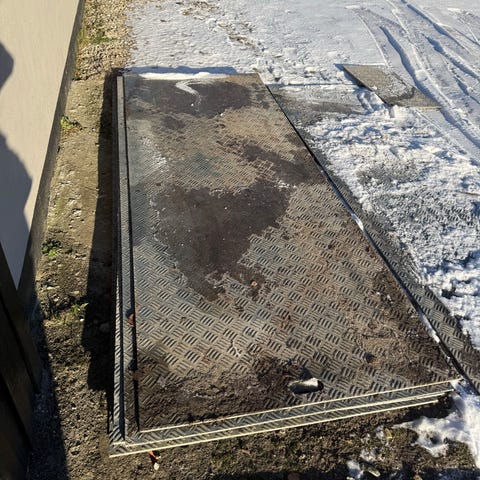 3 stk. Sort køreplader i sort plast med mønster, anvendelig til forskellige formål. Pladen har to udskæringer til håndtag, hvilket gør den nem at håndtere og flytte.