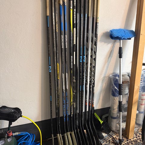 Bauer, Mission, CCM og Warrior ishockeystave til ishockey. Staverne har forskellige størrelser og farver, og er designet til brug i ishockeysporten.