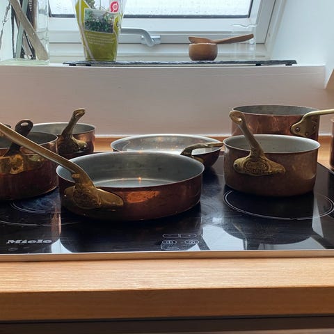 Samling af gamle gedigne kobber pander og gryder. De fremstår med brugsspor, så se billeder. Sælges samlet.