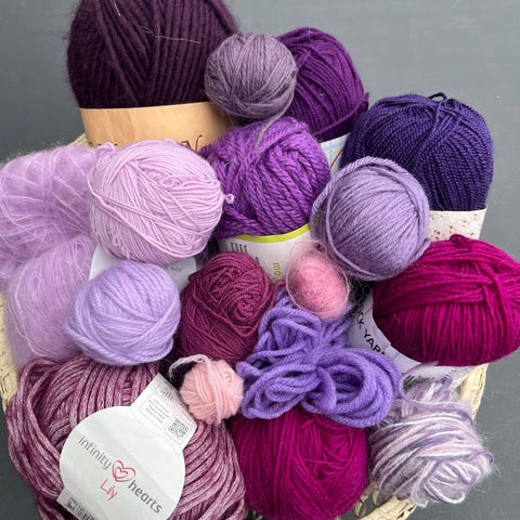 Pakke med garn i flere farver, herunder lyserød, lyseblå, beige og pink. Garnet er i forskellige størrelser og tykkelser, egnet til strikning eller hækling.