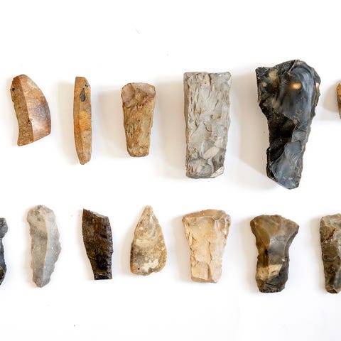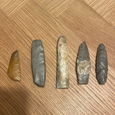 Samling bestående af forskellige flintredskaber og fossiler i varierende størrelser og former. Materialerne inkluderer flint og fossile aflejringer. Kan anvendes til samlerformål eller studier af oldtidshåndværk og geologi.