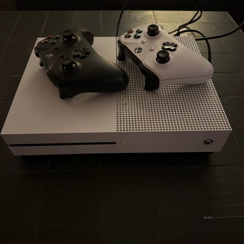 Microsoft Xbox One konsol tilsluttes via HDMI og USB-porte. Konsollen har netværksforbindelse og leveres med strømforsyning. Sort farve, designet til hjemmeunderholdning og spil.