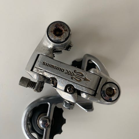 Shimano bagskifter til cykel. Sort metal med bevægelige dele til kædeføring. Passer til cykler med standard bagskiftermontering.