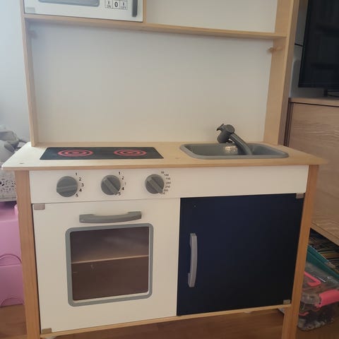 Måler ca 45 cm i højden i alt - bordet alene ca 34 cm. Den er ca 24 cm dyb og 38 cm lang - inkl håndtag.