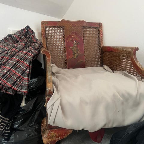 Fin gammel lænestol med blomstret stof. Højden i ryggen er 114 cm. Siddehøjden er 45 cm. God stand.