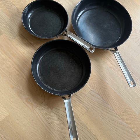 IKEA stegepander i metal med håndtag. Sættet indeholder to stegepander i forskellige størrelser. Egnet til madlavning på komfur. Ø24 og 28 cm… 100.- kr for begge..
