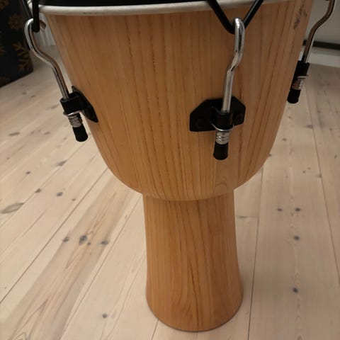 Remo Kids Percussion Djembe tromme med farverigt mønster og bærestrop. Trommen er designet til børn og har et holdbart trommeskind og en justerbar rem til nem transport.