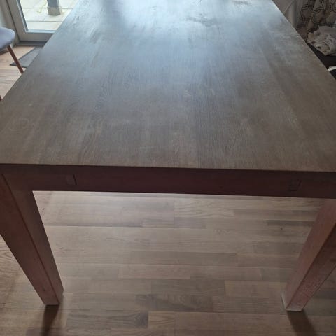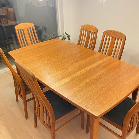 Spisebord med seks stole i mørkt træ. Der følger to ekstra plader med på 50 cm.
