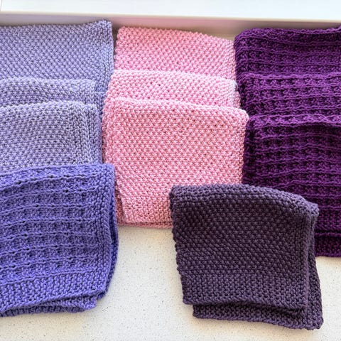 Hjemmelavet, hjemmestrikket i brun og grøn farve i bomuldsgarn. Målene er cirka 24/26 i bredde og længde. De krymper 5-10% i første vask.