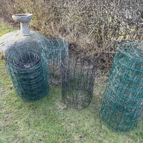 Trådhegn af metal med grøn belægning. Anvendes til indhegning i haven eller til beskyttelse af planter.