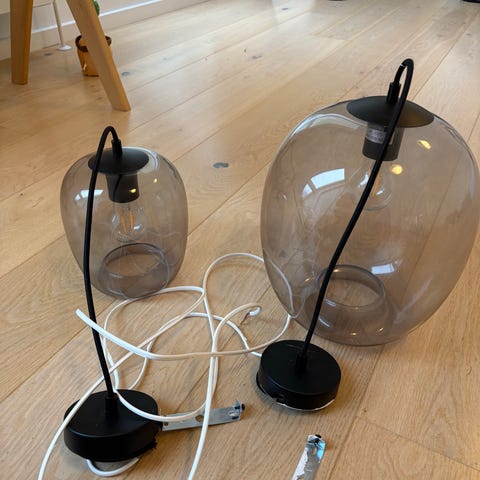 Super fine glas loftslamper. De sælges uden fatning og ledning. De minder meget om “Lyngby-design” som vaserne, men jeg kender ikke navnet på designeren. Derfor er det heller ikke IKEA, men jeg skulle vælge noget?