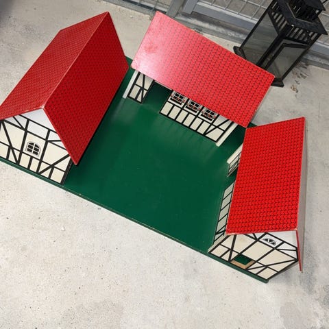 Bondegård med aftagelig tag og dyr. Gærdet rundt om den grønne plade er ikke helt intakt