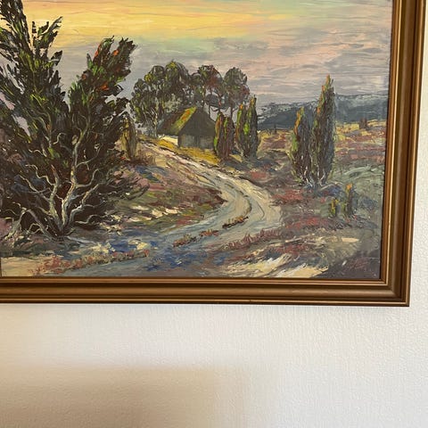 Imponerende og stort oliemaleri af Skovvej. Grå-hvid ramme og cirka mål 150 x 100 cm. Skal afhentes. Fast pris