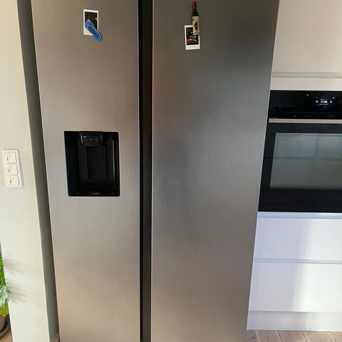 Samsung amerikanerkøleskab med 4,5 liters vandbeholder, så køleskabet ikke skal tilsluttes vandtilførsel. Kan lave isterninger, crushed is og koldt vand.