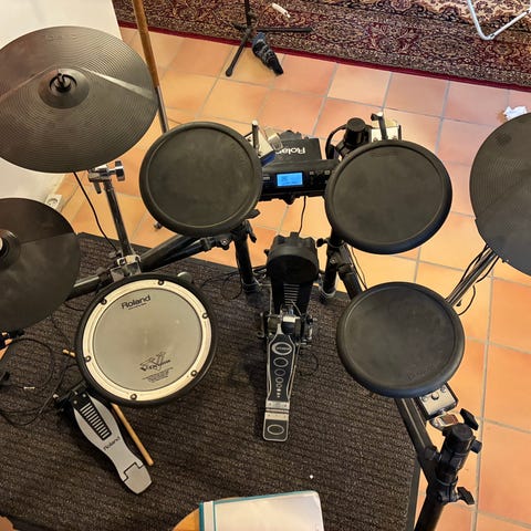 Sælger min datters Roland TD‑1DMK mesh trommesæt, som står i flot og fuldt fungerende stand. Alle pads spiller jævnt og responsivt, og modulet kører uden problemer. Perfekt til øvning derhjemme, stille spil eller som kompakt setup til mindre produktioner.