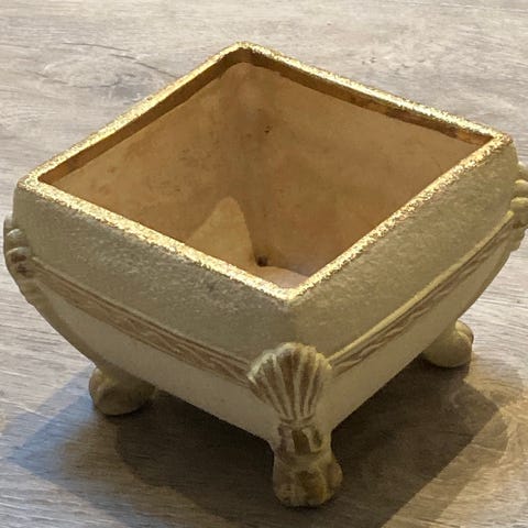 Urtepotteskjuler til lille plante samt skål. Urtepotteskjuleren måler 6,5 cm i højden og har ganske små brugsspor.