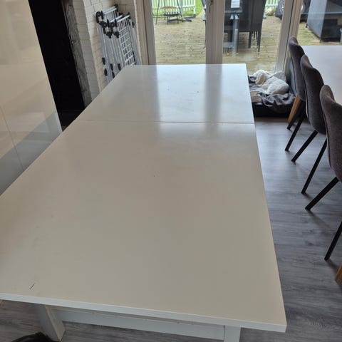 Spisebord 150/200x85. Har to skader i bordpladen.