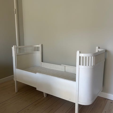 Fin Juno seng i eg. Sengen kan justeres i længden og bruges med eller uden tremmer. God stand ingen defekt.