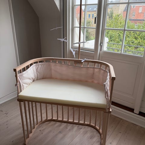 Hjemmetbygget bedside crib / seng i krydsfiner med lille natbord. Slebet og lakeret så det er ingen skarpe kanter.