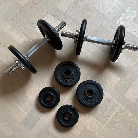 Sæt bestående af to håndvægte med en vægt på 15 kg hver. Fremstillet i sort støbejern med sekskantet form for stabilitet under træning.