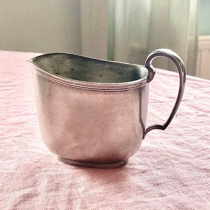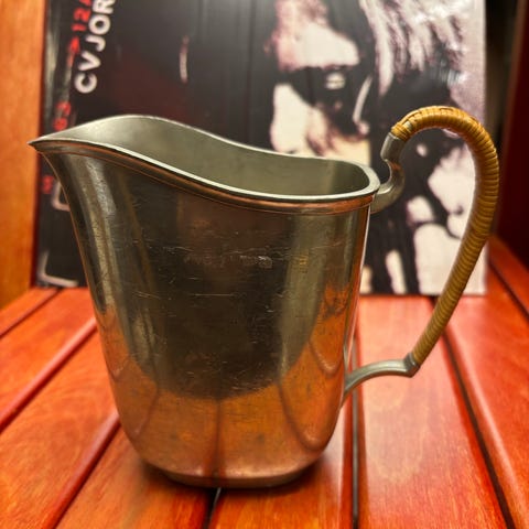 Tekande fremstillet i tin med håndtag i flettet materiale. Tekanden har en rund form og et låg med dekorativt greb i flet.
