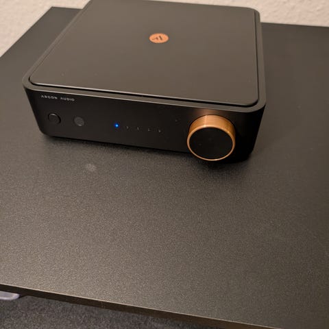 Superkompakt hi-fi-forstærker med flot lyd, Bluetooth, HDMI-indgang til TV-lyd og indgang til pladespiller. Et røverkøb til prisen.