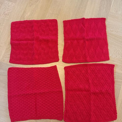 Hjemmelavet, hjemmestrikket i mørkegrå farve i bomuldsgarn. Målene er cirka 26/28 i bredde og længde. De krymper 5-10% i første vask.