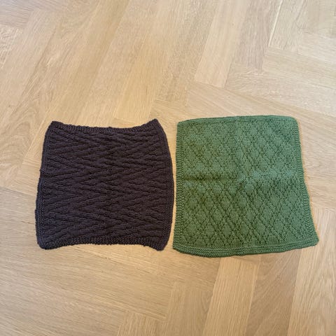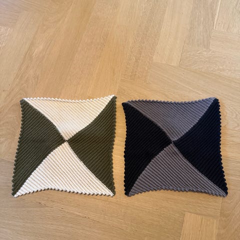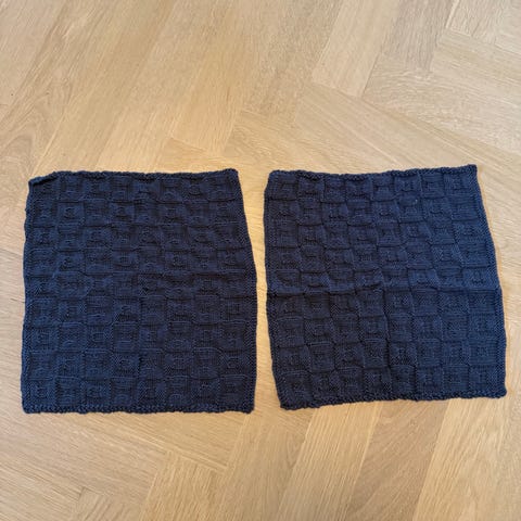 Hjemmelavet, hjemmestrikket i rød farve i bomuldsgarn. Målene er cirka 26/28 i bredde og længde. De krymper 5-10% i første vask.