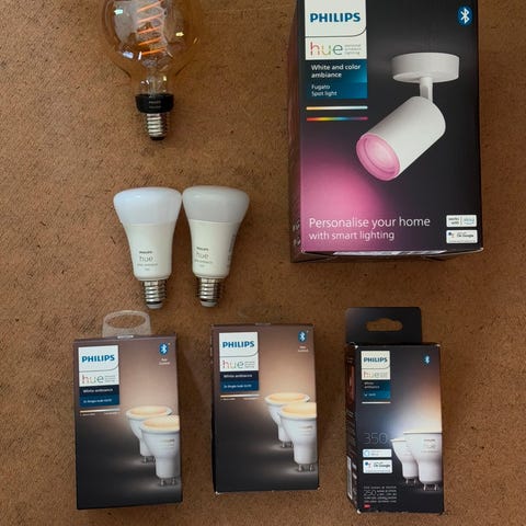 Masser af Phillips Hue pærer, bridge, fjernbetjeninger