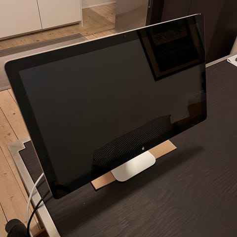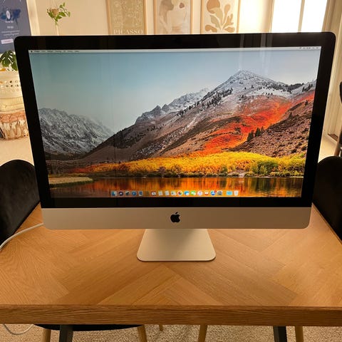 Apple iMac med 27 tommer skærm. Skærmen har en aluminiumsramme og flere USB-porte på bagsiden. Skærmen er designet til stationær brug og har tilslutningsmuligheder via USB og strømkabel.