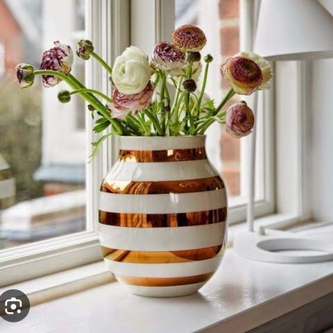 Kähler vase med dekorative kobber striber. Vasen har et moderne design med horisontale kobberstriber på en hvid baggrund. Velegnet til brug som dekoration i hjemmet.