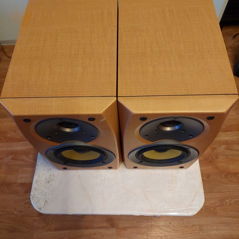 Sony SS-CRB5 højttalere i træ med grå front. Designet til at levere lyd i hjemmemiljøer. Passer til brug med stereosystemer og andre lydkilder.