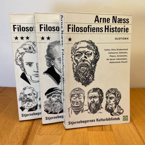 Arne Næss Filosofiens Historie - bøger i 3 bind, der dækker filosofihistorie. Udgivet i 60'erne