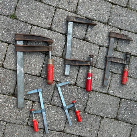 Unbranded skruetvinge med en længde på 40 cm. Tvingens krop er lavet af metal, og håndtaget har et rødt plastikgreb. Bruges til fastspænding af materialer under bearbejdning.