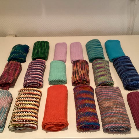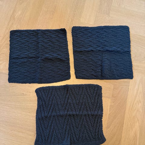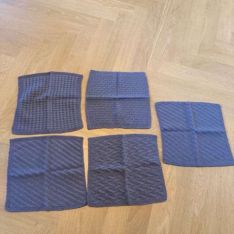 Hjemmelavet, hjemmestrikket i blå farve i bomuldsgarn. Målene er cirka 24/26 i bredde og længde. De krymper 5-10% i første vask.